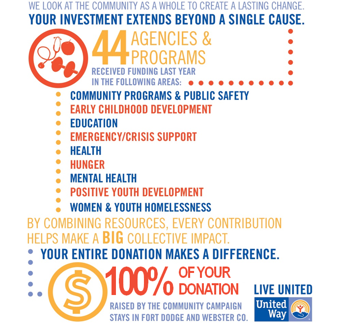 Please feel free to contact the United Way of Greater Fort Dodge at 515.573.3179 if you have any questions on how you can support the Community Campaign. Every dollar donated to the Community Campaign can help make a difference.